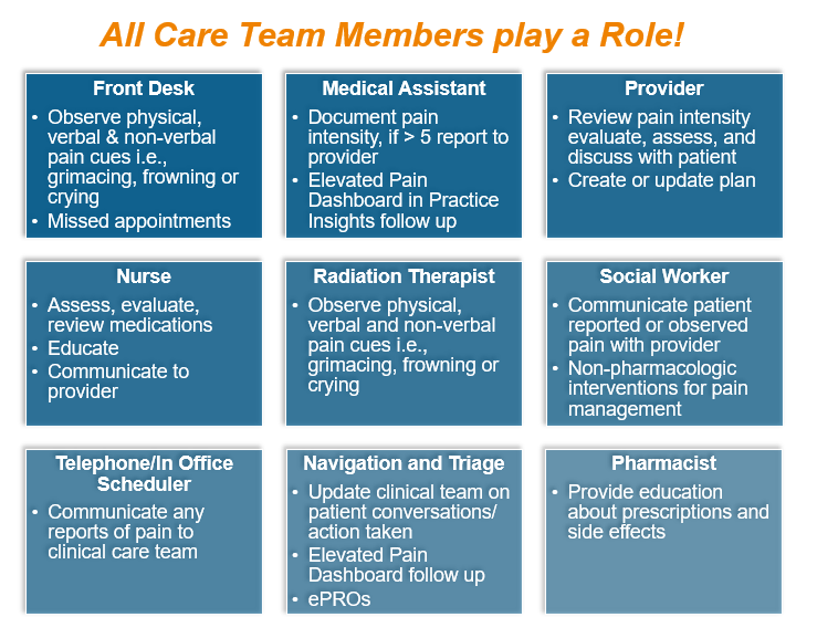 Only specified clinicians may modify the patient’s treatment plan, but all members of the care team can participate in recognizing patients in pain, asking questions and contributing to the solution, at the level appropriate to their scope of practice.